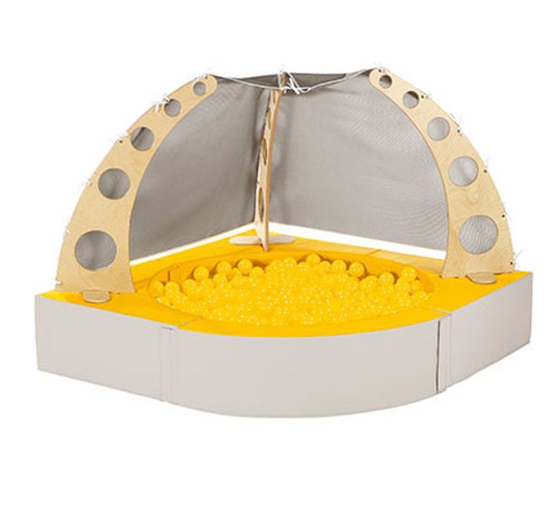 Colores a elegir AZUL CLARO / MARFIL - VERDE CLARO / MARFIL - AMARILLO/MARFIL - L: 144 cm - An: 144 cm - Alt.: 118 cm- Gr: 15 cm. - De LONA REVESTIDA (elementos de piscina), CONTRACHAPADO barnizado (estructura) y rejilla PLASTIFICADA. - Consta de 3 piezas de esquina, 1 pieza de cuarto de círculo, 3 montantes de madera y 2 telas simples, 250 bolas opacas y 250 bolas transparentes. - Lavar con un paño suave en agua jabonosa fría. - Cantidad de bolas ideal: 500 bolas. Sin ftalatos. entrega Se suministra sin montar.