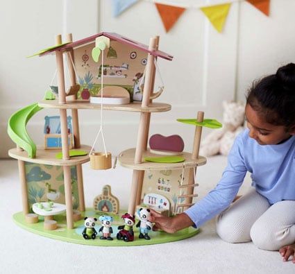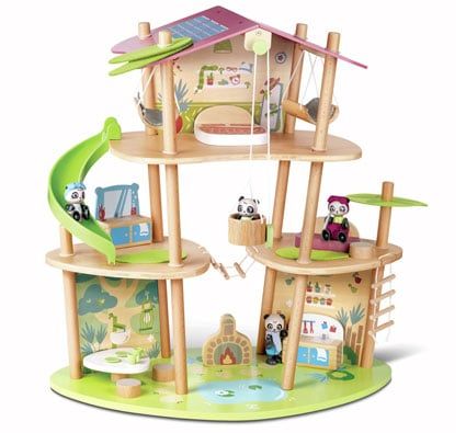 Color Varios - L: 62 cm - An: 34 cm - Alt: 60,5 cm. - De BAMBÚ y MATERIAL DE ORIGEN BIOLÓGICO. - Consta de 1 casa, 4 figuras de panda, 2 hamacas, 1 cama, 1 tocador, 1 sofá, 1 mesa de centro, 2 alfombrillas, 1 sombrilla, 1 mesa, 2 asientos, 1 chimenea, 1 estufa, 2 platos, 2 tazas, 1 cacerola, 1 cesta elevadora con cuerda, 1 puente colgante, 1 tobogán y 1 escalera de cuerda Material de origen biológico. Procedente de bosques ecogestionados entrega Se suministra sin montar.