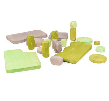 Fabricado en madera maciza. <br>Tamaño: largo 28cm x ancho 14cm x grosor 2cm<br><br>Set de 20 piezas de madera natural, no incluye las figuras y elementos naturales que aparecen en la imagen. <br>El conjunto de piezas sueltas de madera en diferentes formas y tamaños es un recurso imprescindible para el juego de Mini Mundos. Con estas bonitas piezas de madera natural los niños y las niñas podrán crear su Mini mundos construyendo montañas, caminos, valles y todo lo que puedan imaginar. <br>
