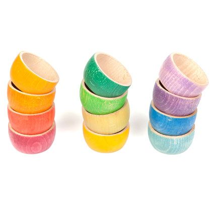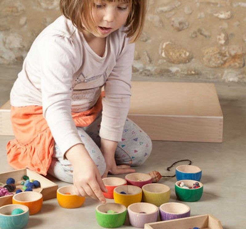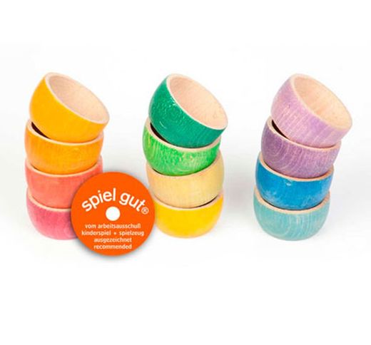 Doce cuencos de doce colores que conforman una escala cromática armónica que aporta equilibrio y un gran sentido estético al juego de los niños y niñas, quienes tienen una gran sensibilidad a la belleza.<br><br>Perfectos para complementar el juego heurístico con el llenar y el vaciar, los traspasos y el cargar. Un cuenco puede servir para tapar otro y así esconder y hacer desaparecer su contenido. Ese juego que genera placer y angustia a la vez: la desaparición, la pérdida y el encuentro de uno mismo y de nuestros tesoros.<br><br>Fabricado en madera de haya procedentes de bosques sostenibles FSC y teñidos con tintes a base agua y no tóxicos. Cumplen con las normas de seguridad europeas.
