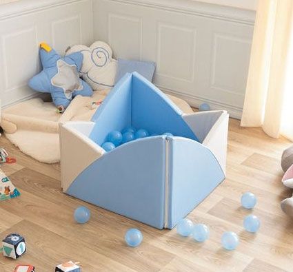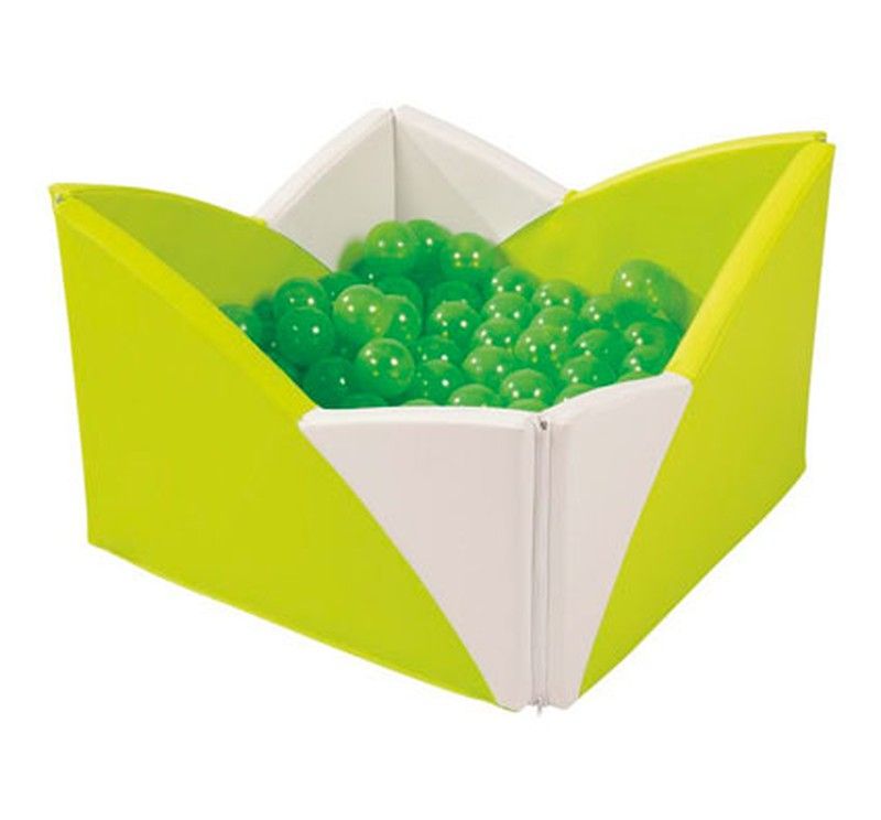 Colores a elegir GRIS CLARO / MARFIL - AZUL CLARO / MARFIL - VERDE CLARO / MARFIL - AMARILLO/MARFIL - L: 72 cm - An: 72 cm - Alt.: de 30 a 50 cm - Gr: 4 cm. - De TELA REVESTIDA. - Consta de 1 piscina, 1 tela de fondo y unas 120 bolas transparentes. - Cantidad de bolas ideal: 120 bolas. Sin ftalatos.